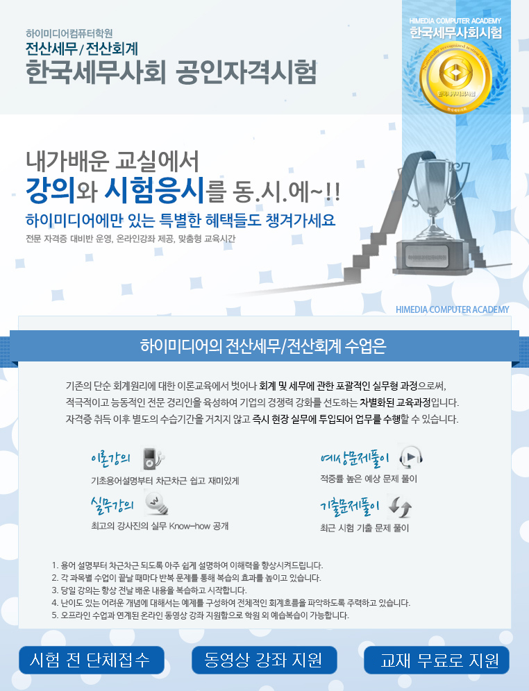 종로 캠퍼스 [전산세무회계 학원 자체시험 공지] ★ 2014 6월1일자 ★ Post. 2014.03.15 교육과정 상세 안내 : http://jongro.himedia.co.kr/course/courseList.asp?courseType=1&courseGroup=cg17