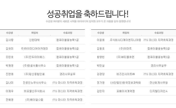 하이미디어컴퓨터학원 노원캠퍼스 2015년 6월 성공취업자 명단입니다.